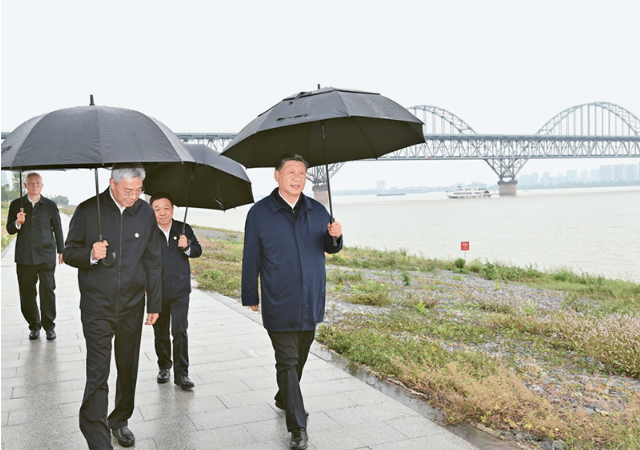 2023年10月10日至13日,中共中央总书记、国家主席、中央军委主席习近平在江西考察。这是10日下午,习近平在长江国家文化公园九江城区段考察时,冒雨沿江堤步行察看沿岸风貌。 新华社记者 谢环驰/摄