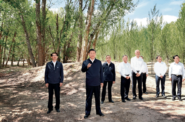 2023年6月5日至6日,中共中央总书记、国家主席、中央军委主席习近平在内蒙古巴彦淖尔考察,并主持召开加强荒漠化综合防治和推进“三北”等重点生态工程建设座谈会。这是6日上午,习近平在临河区国营新华林场考察。 新华社记者 谢环驰/摄