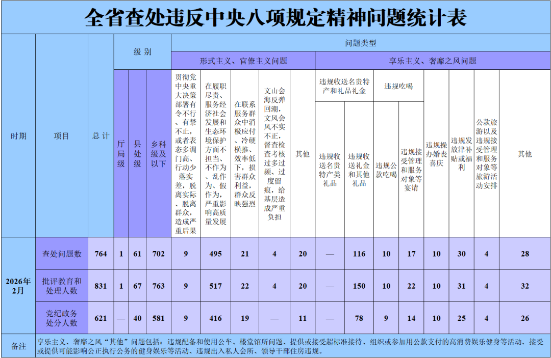 2026年2月,黑龙江省纪检监察机关共查处违反中央八项规定精神问题764起,批评教育和处理831人,其中党纪政务处分621人。从查处问题类型看,在履职尽责、服务经济社会发展和生态环境保护方面不担当、不作为、乱作为、假作为,严重影响高质量发展方面,2月查处问题495起,占查处形式主义、官僚主义问题总数的90.2%。2月,查处的违规收送名贵特产和礼品礼金、违规发放津补贴或福利、违规吃喝3类问题,分别占查处享乐主义、奢靡之风问题总数的54%、14%、12.6%。