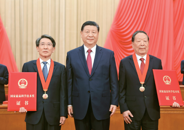 2024年6月24日,全国科技大会、国家科学技术奖励大会和中国科学院第二十一次院士大会、中国工程院第十七次院士大会在北京人民大会堂隆重召开。中共中央总书记、国家主席、中央军委主席习近平向获得2023年度国家最高科学技术奖的武汉大学李德仁院士(右)和清华大学薛其坤院士(左)颁奖。 新华社记者 鞠鹏/摄