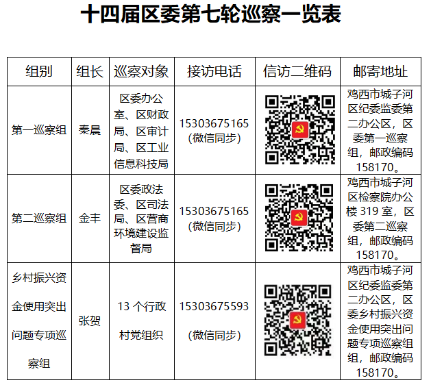 经区委批准,十四届区委第七轮巡察对象分别是中共城子河区区委办公室联合党支部、中共城子河区财政审计联合党支部、中共城子河区工业信息科技局党总支,中共城子河区营商医保联合党支部、中共城子河区司法局联合党支部、中共城子河区委政法委联合党支部常规巡察及巡察13个行政村党组织。
