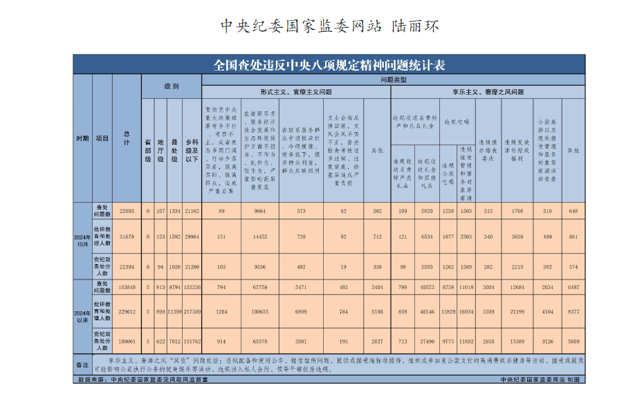 11月28日,中央纪委国家监委公布了2024年10月全国查处违反中央八项规定精神问题汇总情况。当月,全国共查处违反中央八项规定精神问题22603起,批评教育和处理31679人,其中党纪政务处分22394人,这是连续第134个月公布月报数据。