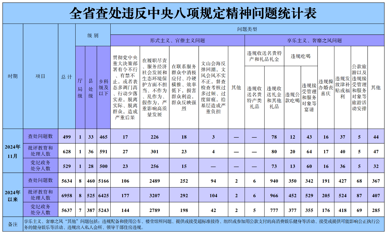 2024年11月,黑龙江省纪检监察机关共查处违反中央八项规定精神问题499起,批评教育和处理628人,其中党纪政务处分529人。